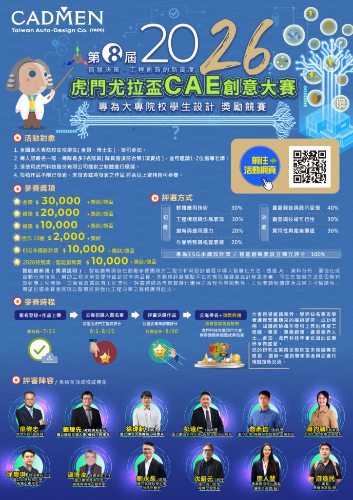 為推廣CAE(電腦輔助工程)技術應用,並培育具備創新思維的工程人才,2026虎門尤拉盃 CAE 創意大賽即日起正式開跑!