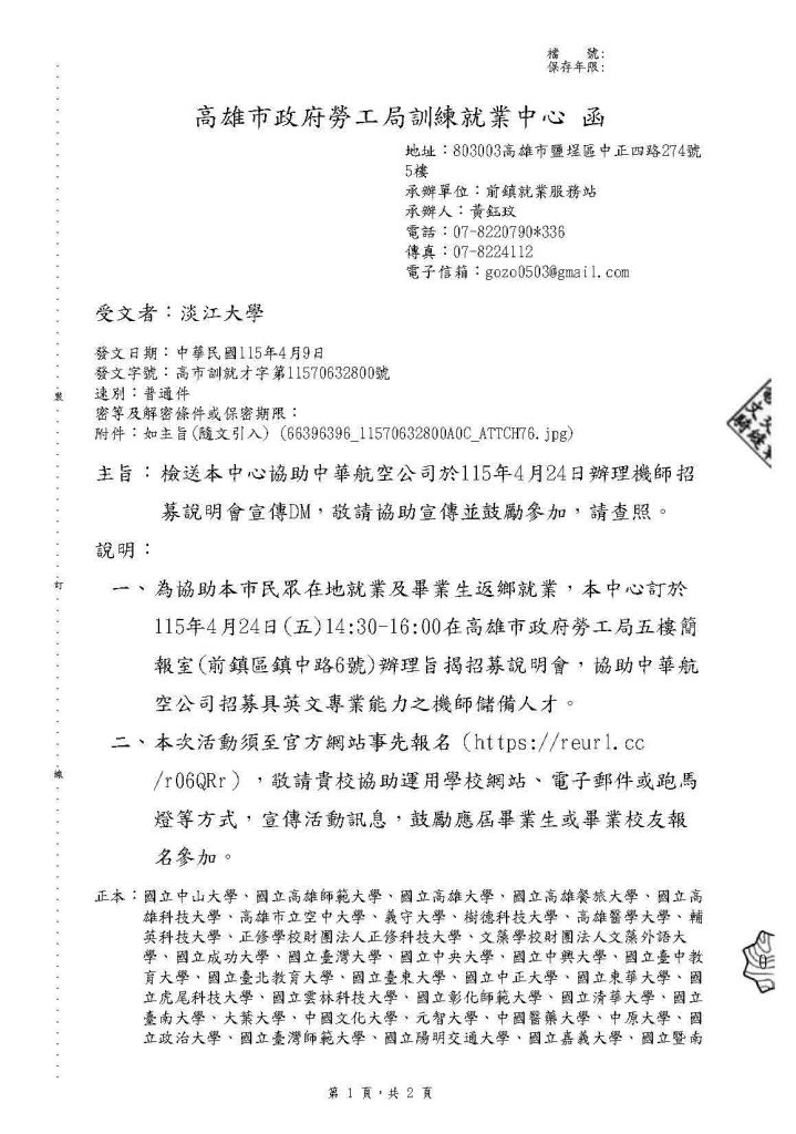 高雄市政府勞工局訓練就業中心-中華航空機師招募說明會